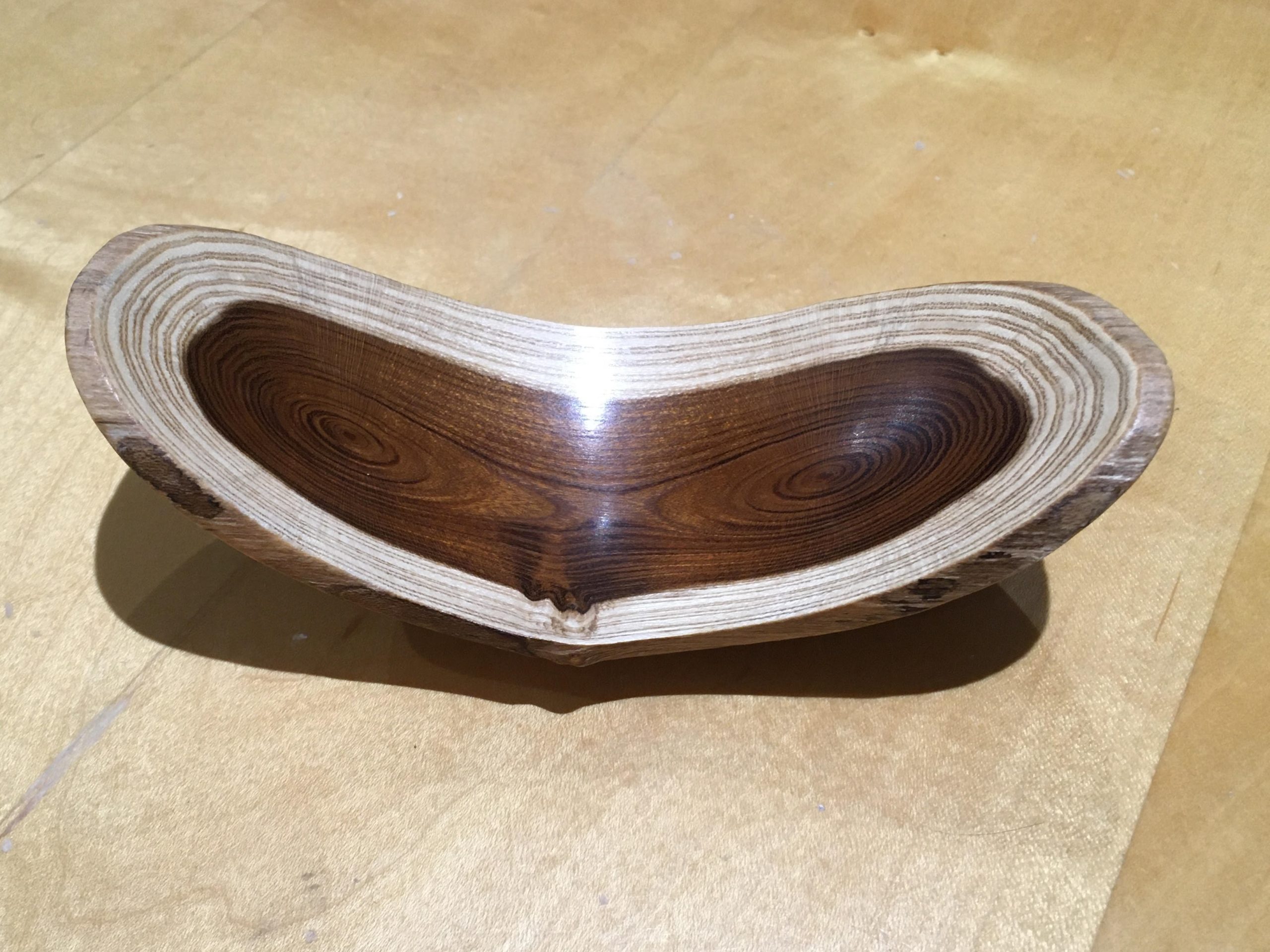 Offset winged bowl Ash 12” x 4” x 4” (300mm x 100mm x 100mm) turned to 1/10” (2.5mm). Tuned side